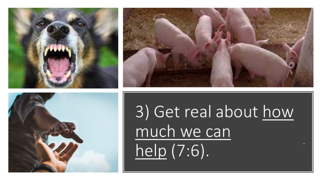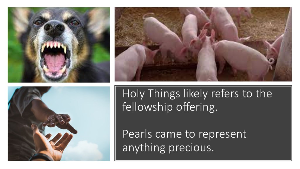 1“Judge not, that you be not judged.2For with the judgment you pronounce you will be judged, and with the measure you use it will be measured to you.3Why do you see the speck that is in your brother’s eye, but do not notice the log that is in your own eye?4Or how can you say to your brother, ‘Let me take the speck out of your eye,’ when there is the log in your own eye?5You hypocrite, first take the log out of your own eye, and then you will see clearly to take the speck out of your brother’s eye.6“Do not give dogs what is holy, and do not throw your pearls before pigs, lest they trample them underfoot and turn to attack you.